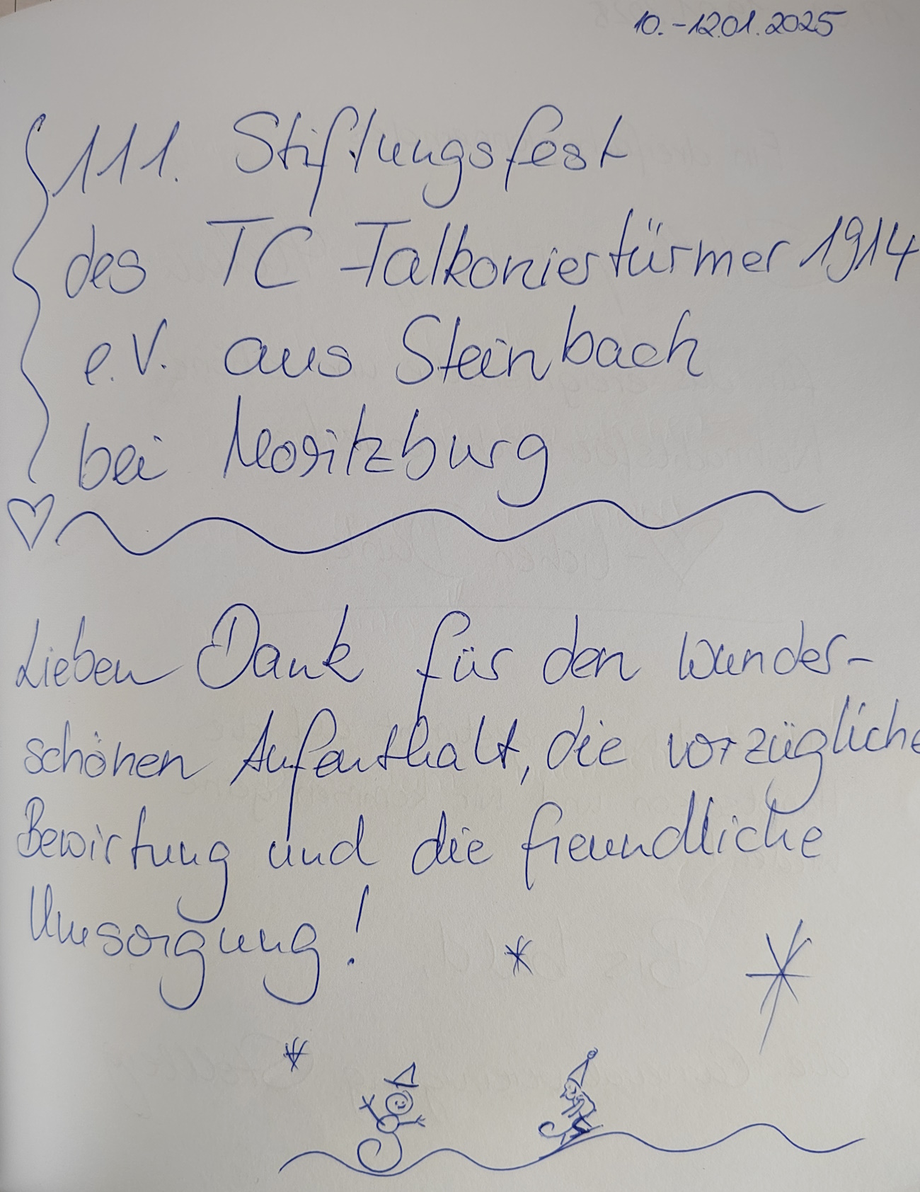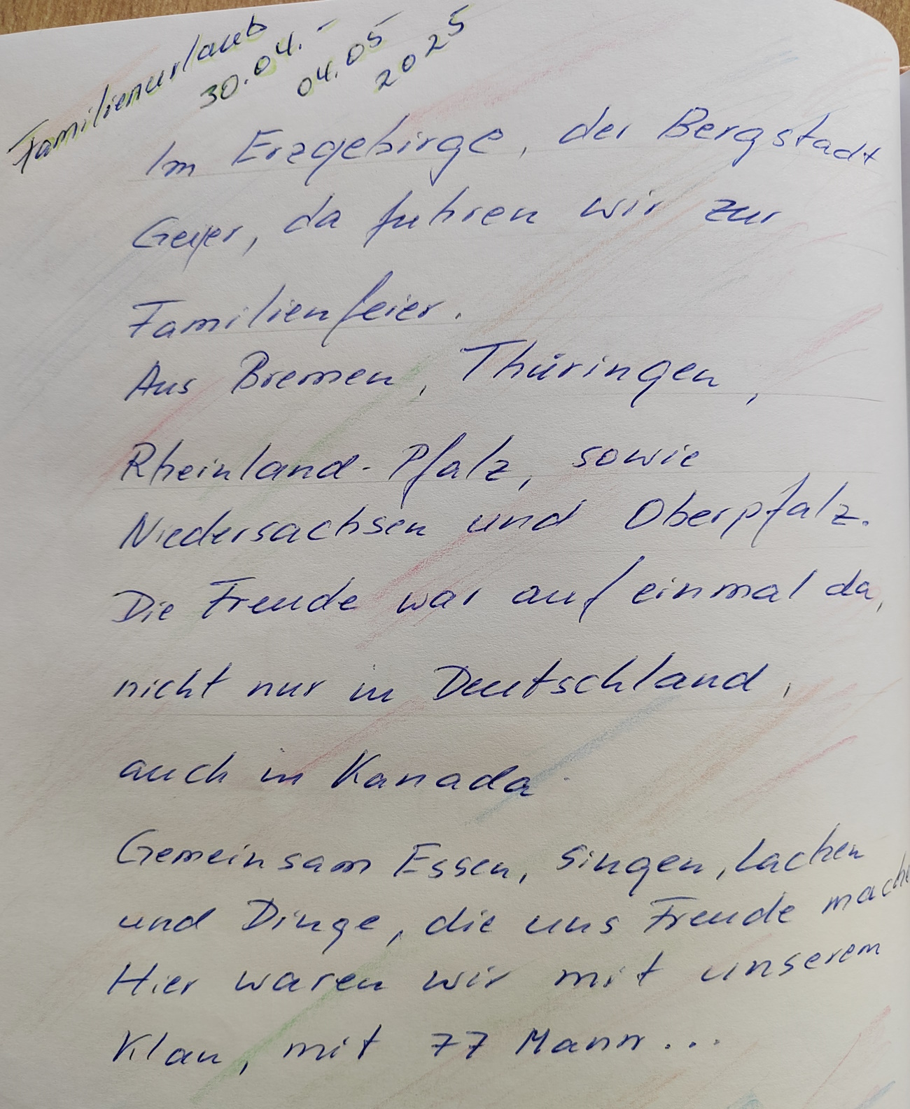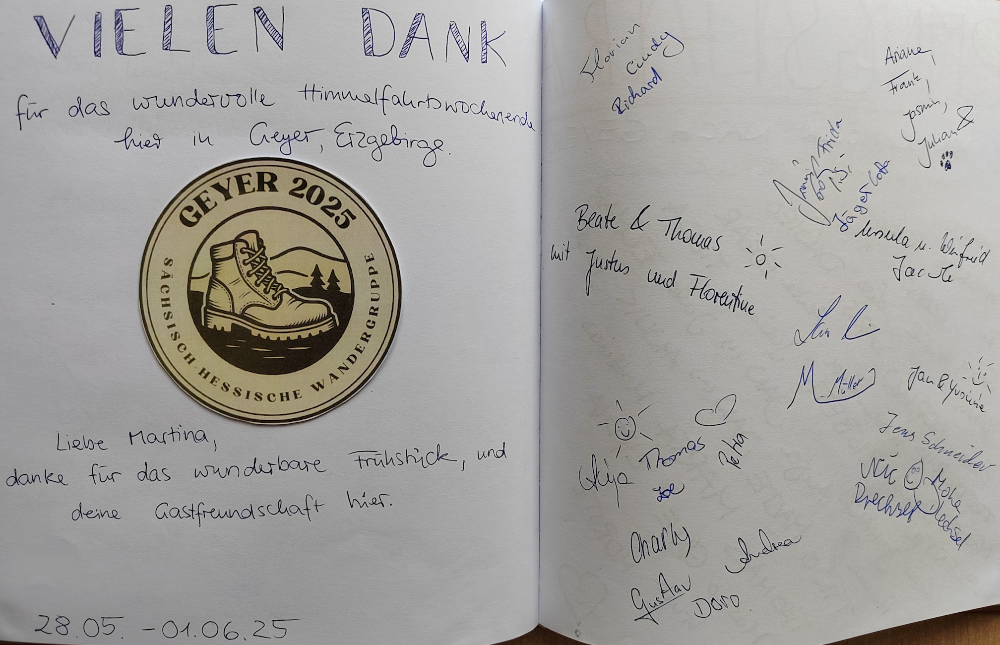 Wir sind sehr froh, dass wir unser jährliches Treffen im Freundeskreis diesmal hier in Geyer ausgerichtet haben. Die Herberge hat uns genau das geboten, was wir benötigen. Die vielen Kinder haben sich sehr wohl gefühlt, weil es draußen und drinnen genügend Platz zum Spielen gibt. In kurzer Entfernung gab es viel zu entdecken. Wir kommen gern wieder, da waren sich alle einig. Wir hoffen, dass die wundervolle Herberge noch lange erhalten bleibt. Vielen Dank und bis bald!
