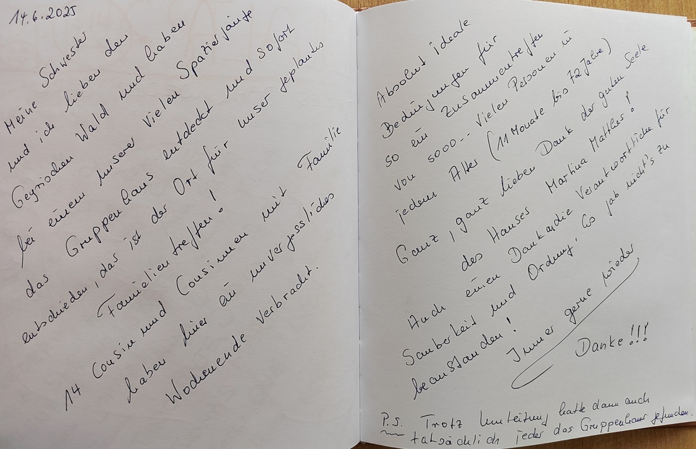 Wir hatten eine schöne Woche im Gruppenhaus Geyer mit unserer Familie. Wir haben die Natur und die Gemeinschaft hier in diesem Haus sehr genossen.