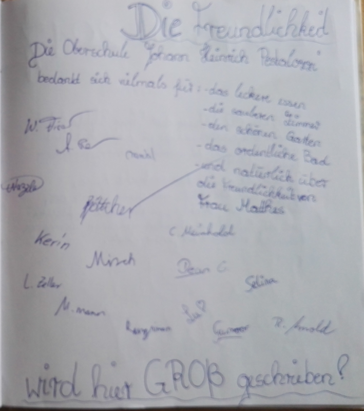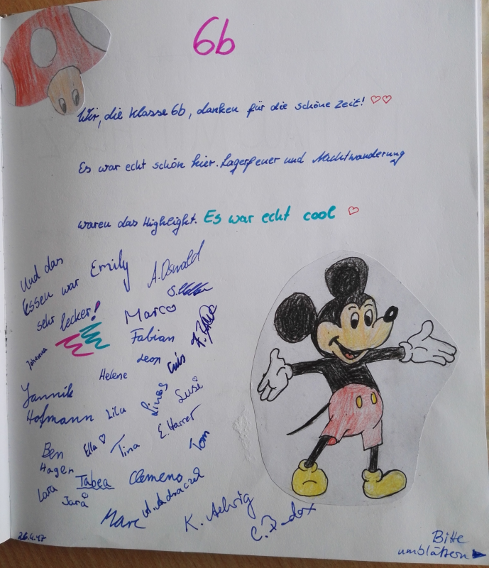 Wir, die Klasse 6b, danke für die schöne Zeit. Es war echt schön hier. Lagerfeuer und Nachtwanderung waren das Highlight. Es war echt cool.