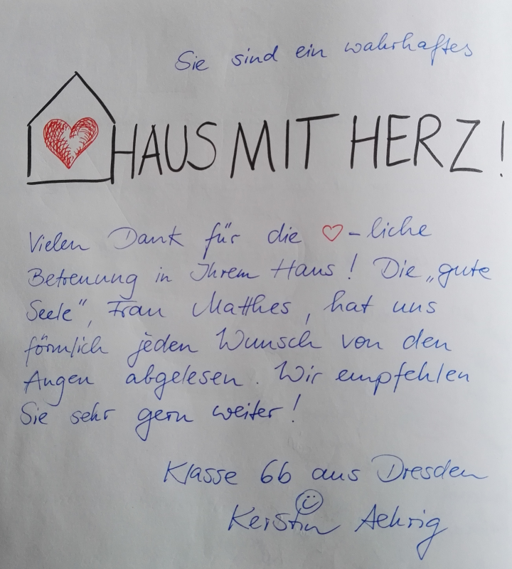 Sie sind ein wahrhaftes Haus mit Herz! Vielen Dank für die herzliche Betreuung in Ihrem Haus! Die "gute Seele", Frau Matthes, hat uns förmlich jeden Wunsch von den Augen abgelesen. Wir empfehlen Sie sehr gern weiter!