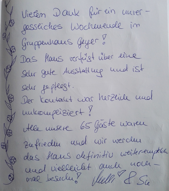 Danke für die tolle Unterkunft, im Gruppenhaus Geyer. Hier haben wir uns wohl gefühlt, viel Spaß gehabt, tolle Erlebnisse gehabt und vorallem unsere Ministrantengemeinschaft gestärkt. Wir freuen uns darüber, dass wir hier sein durften und wünschen allen weiteren Gruppen genauso viel Freude wie wir hatten.