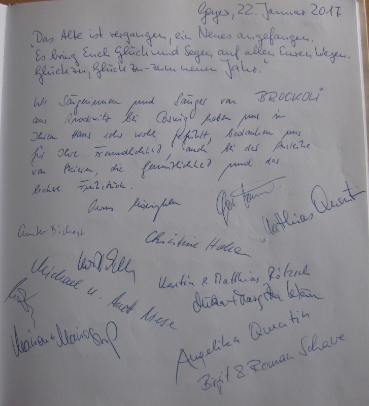 Wir Sängerinnen und Sänger von BROCKOLI aus Brockwitz bei Coswig haben uns in Ihrem Haus sehr wohl gefühlt, bedanke uns für Ihre Freundlichkeit, auch bei der Ausleihe von Skiern, die Freundlichkeit und das leckere Frühstück.