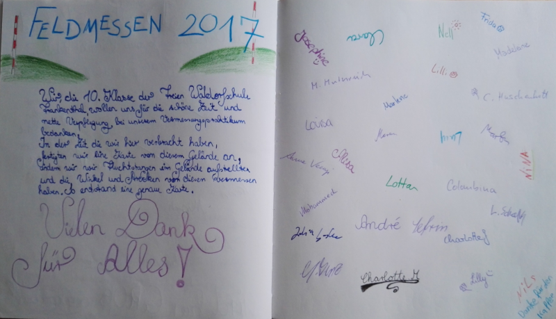 Wir, die 10. Klasse der Freien Waldorfschule Frankenthal, wollen uns für die schöne Zeit und nette Verpflegung, bei unserem Vermessungspraktikum, bedanken.
