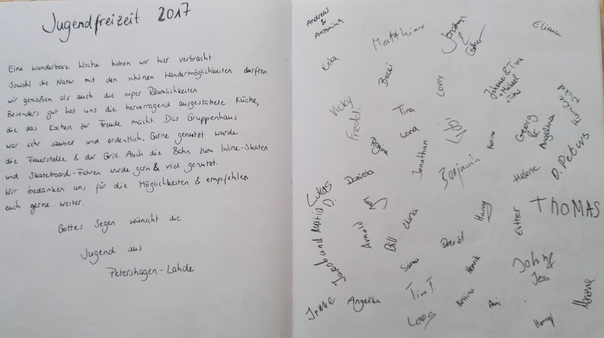Eine wunderbare Woche haben wir hier verbracht. Sowohl die Natur mit ihren schönen Wandermöglichkeiten durften wir genießen als auch die super Räumlichkeiten. Besonders gut hat uns die hervorragend ausgestattete Küche, die das Kochen zur Freude macht. Das Gruppenhaus war sehr sauber und ordentlich. Gern genutzt wurde die Feuerstelle & der Grill. Auch die Bahn zum Inline-Skaten und Skateboard-Fahren wurde gern & viel genutzt. Wir bedanken uns für die Möglichkeiten & empfehlen euch gerne weiter.