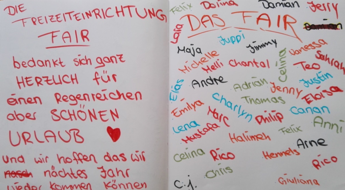 DIE FREIZEITEINRICHTUNG FAIR bedankt sich ganz HERZLICH für einen Regenreichen aber SCHÖNEN URLAUB! Und wir hoffen, dass wir nächstes Jahr wieder kommen können.