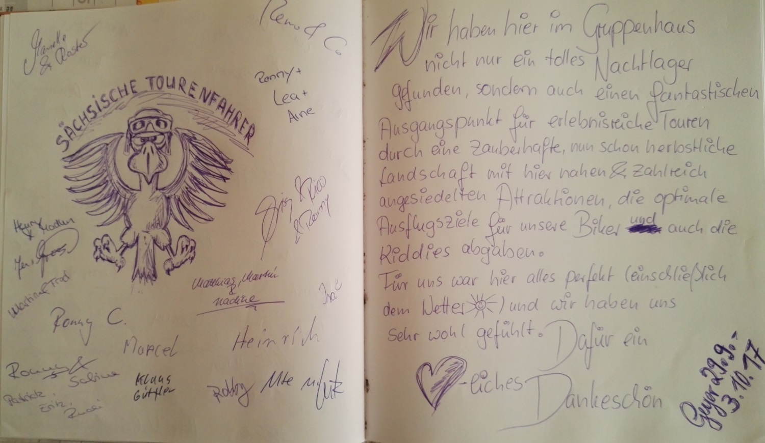 Wir haben hier im Gruppenhaus nicht nur ein tolles Nachtlager gefunden, sondern auch einen fantastischen Ausgangspunkt für erlebnisreiche Touren durch eine zauberhafte, nun schon herbstliche Landschaft mit hier nahen & zahlreich angesiedelten Attraktionen, die optimale Ausflugsziele für unsere Biker und auch die Kiddies abgaben.