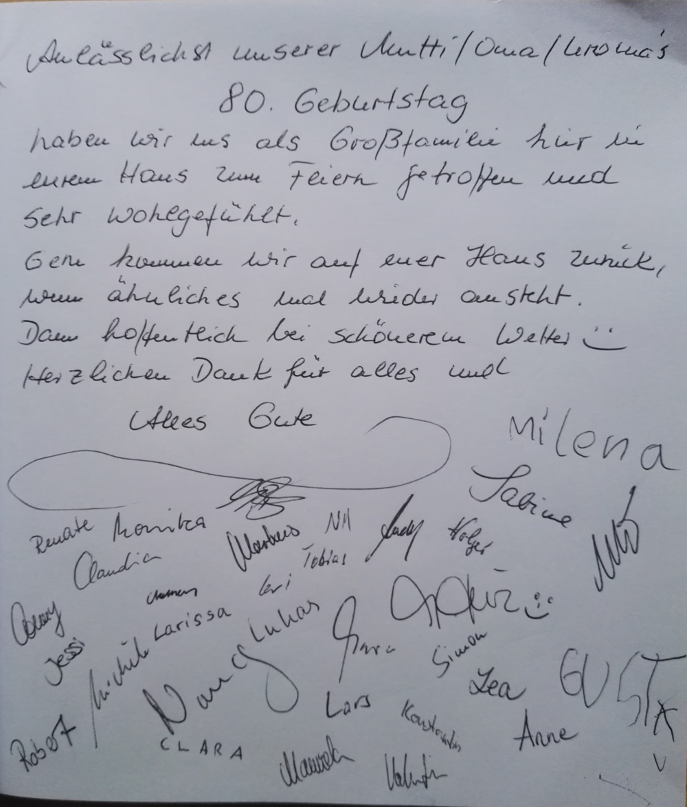Anlässlichst unserer Mutti/Oma/Uroma's 80. Geburtstag haben wir uns als Großfamilie hier in eurem Haus zum Feiern getroffen und sehr wohlgefühlt. Gern kommen wir auf euer Haus zurück, wenn ähnliches mal wieder ansteht. Dann hoffentlich bei schönerem Wetter :) Herzlichen Dank für alles und Alles Gute.