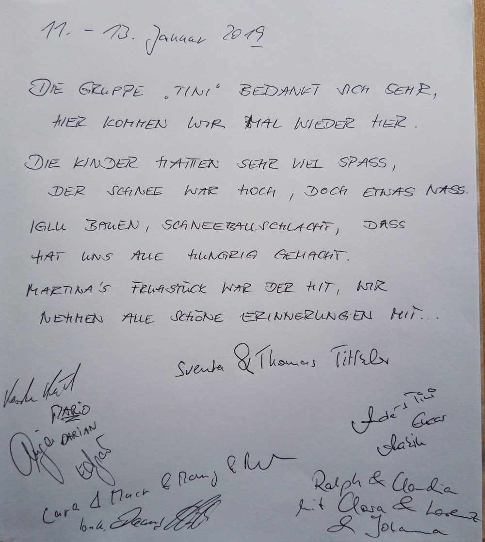 Die Gruppe "Tini" bedankt sich sehr, hier kommen wir mal wieder her. Die Kinder hatten sehr viel Spaß, der Schnee war hoch, doch etwas nass. Iglu bauen, Schneeballschlacht, das hat uns alle hungrig gemacht. Martina's Frühstück war der Hit, wir nehmen alle schöne Erinnerungen mit ...