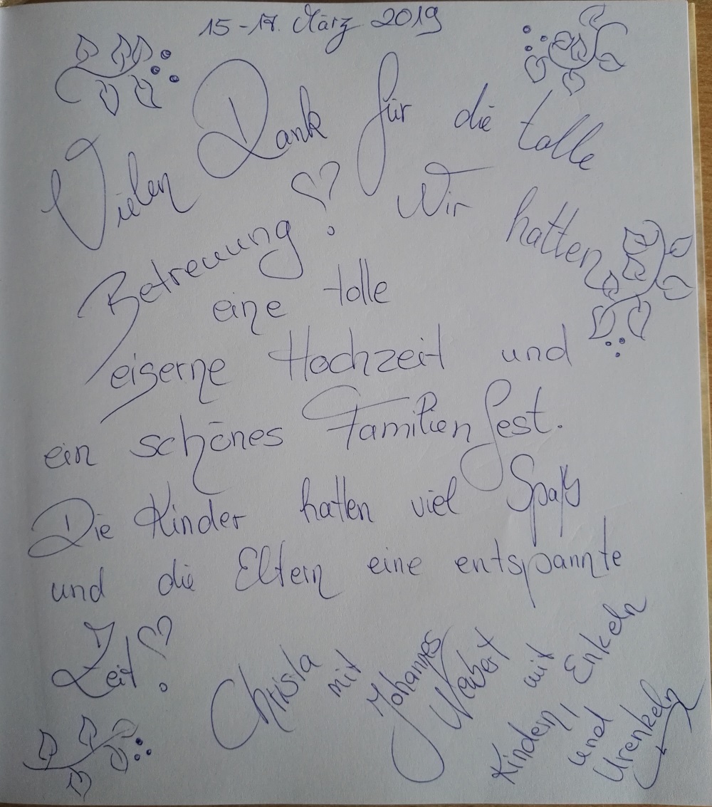 Vielen Dank für die tolle Betreuung! Wir hatten eine tolle eiserne Hochzeit und ein schönes Familienfest. Die Kinder hatten viel Spaß und die Eltern eine entspannte Zeit!