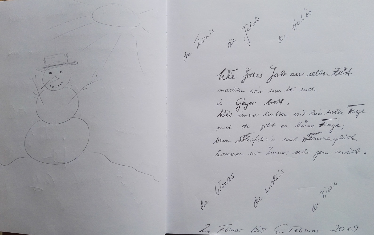 Wie jedes Jahr zur selben Zeit, machten wir uns bei euch in Geyer breit. Wie immer hatten wir hier tolle Tage und da gibt es keine Frage. Beim Skifahr'n und Saunaglück, kommen wir immer sehr gern zurück.