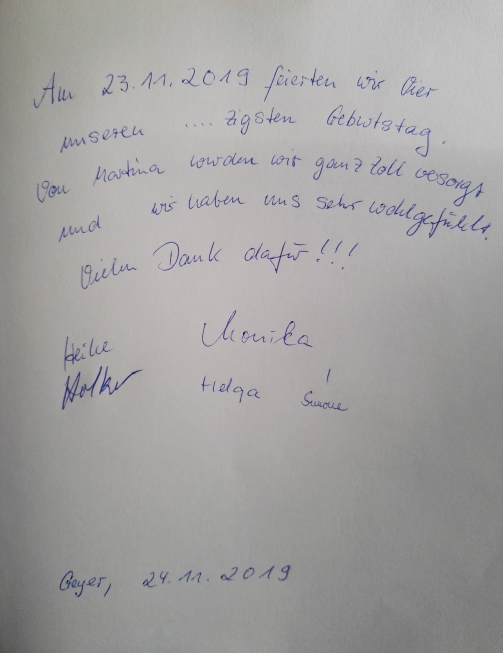 Am 23. 11. 2019 feierten wir Vier unseren ...zigsten Geburtstag. Von Martina wurden wir ganz toll versorgt und wir haben uns sehr wohl gefühlt. Vielen Dank dafür!