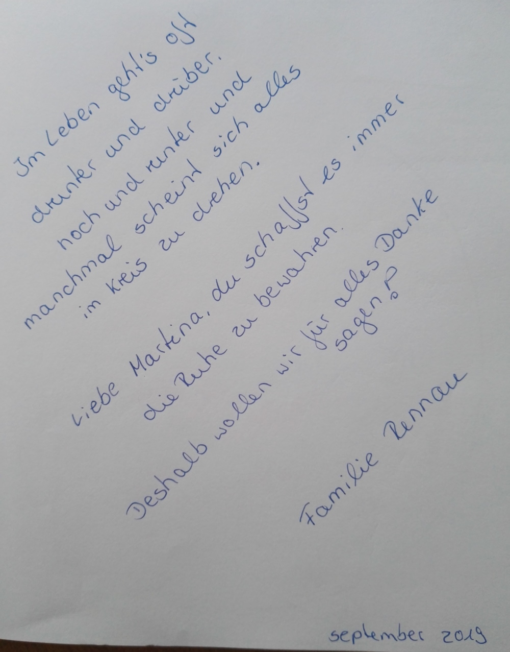Liebe Martina, du schaffst es immer die Ruhe zu bewahren. Deshalb wollen wir für alles Danke sagen!