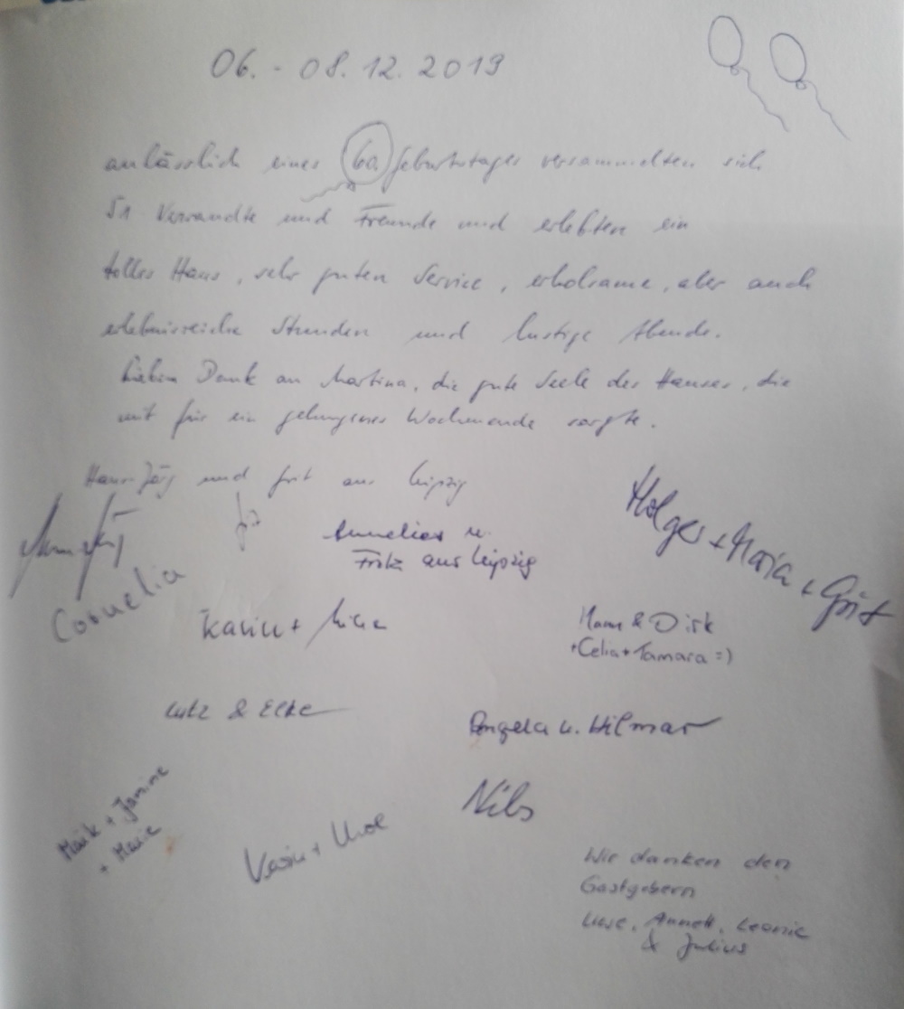 anlässlich eines 60. Geburtstages versammelten sich 51 Verwandte und Freunde und erlebten ein tolles Haus, sehr guten Service, erholsame aber auch erlebnisreiche Stunden und lustige Abende. Lieben Dank an Martina, die gute Seele des Hauses, die mit für ein gelungenes Wochenende sorgte.