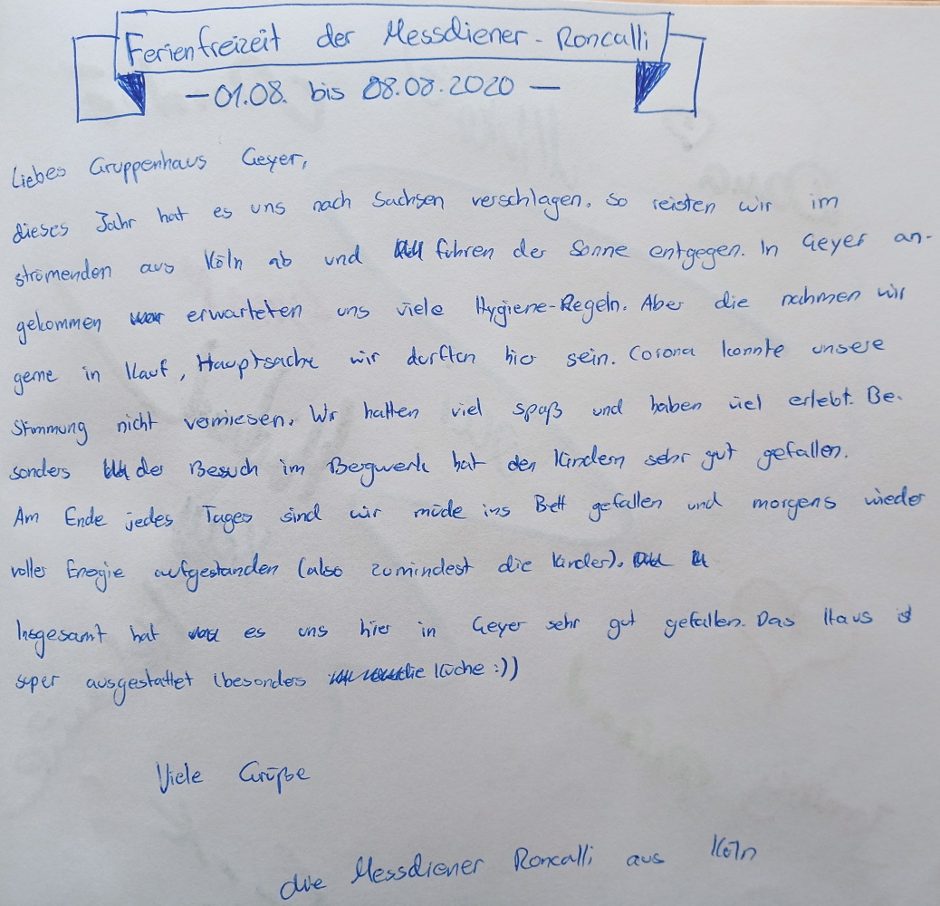 dieses Jahr hat es uns nach Sachsen verschlagen. So reisten wir im strömenden Regen aus Köln ab und fuhren der Sonne entgegen. In Geyer angekommen erwarteten uns viele Hygiene-Regeln. Aber die nahmen wir gern in Kauf, Hauptsache wir durften hier sein. Corona konnte unsere Stimmung nicht vermiesen. Wir hatten viel Spaß und haben viel erlebt. Besonders der Besuch im Bergwerk hat den Kindern sehr gut gefallen. Am Ende jedes Tages sind wir müde ins Bett gefallen und morgens wieder voller Energie aufgestanden (also zumindest die Kinder). Insgesamt hat es uns hier in Geyer sehr gut gefallen. Das Haus ist super ausgestattet (besonders die Küche :)).