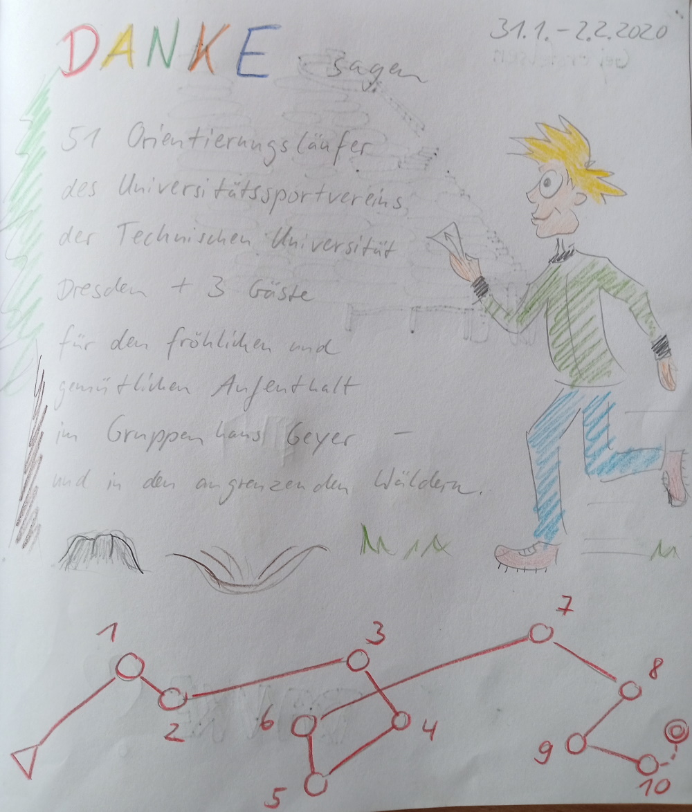 Danke sagen 51 Orientierungsläufer des Universitätssportvereins der TU Dresden + 3 Gäste für den fröhlichen und gemütlichen Aufenthalt im Gruppenhaus Geyer und in den angrenzenden Wäldern.