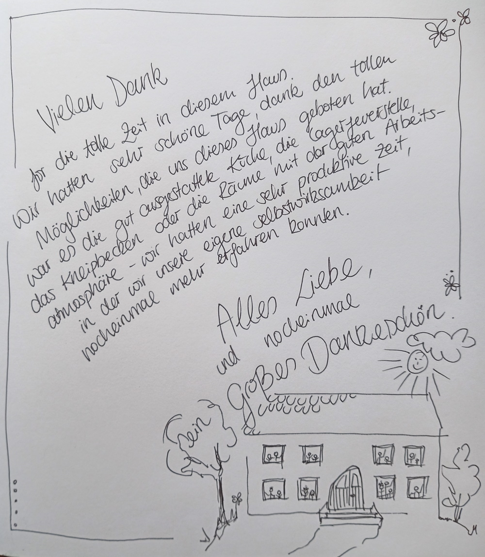 für die tolle Zeit in diesem Haus. Wir hatten sehr schöne Tage, dank den tollen Möglichkeiten, die uns dieses Haus geboten hat. War es die gut ausgestattete Küche, die Lagerfeuerstelle, das Kneipbecken oder die Räume mit der guten Arbeitsatmosphäre - wir hatten eine sehr produktive Zeit, in der wir unsere eigene Selbstwirksamkeit noch einmal mehr erfahren konnten.