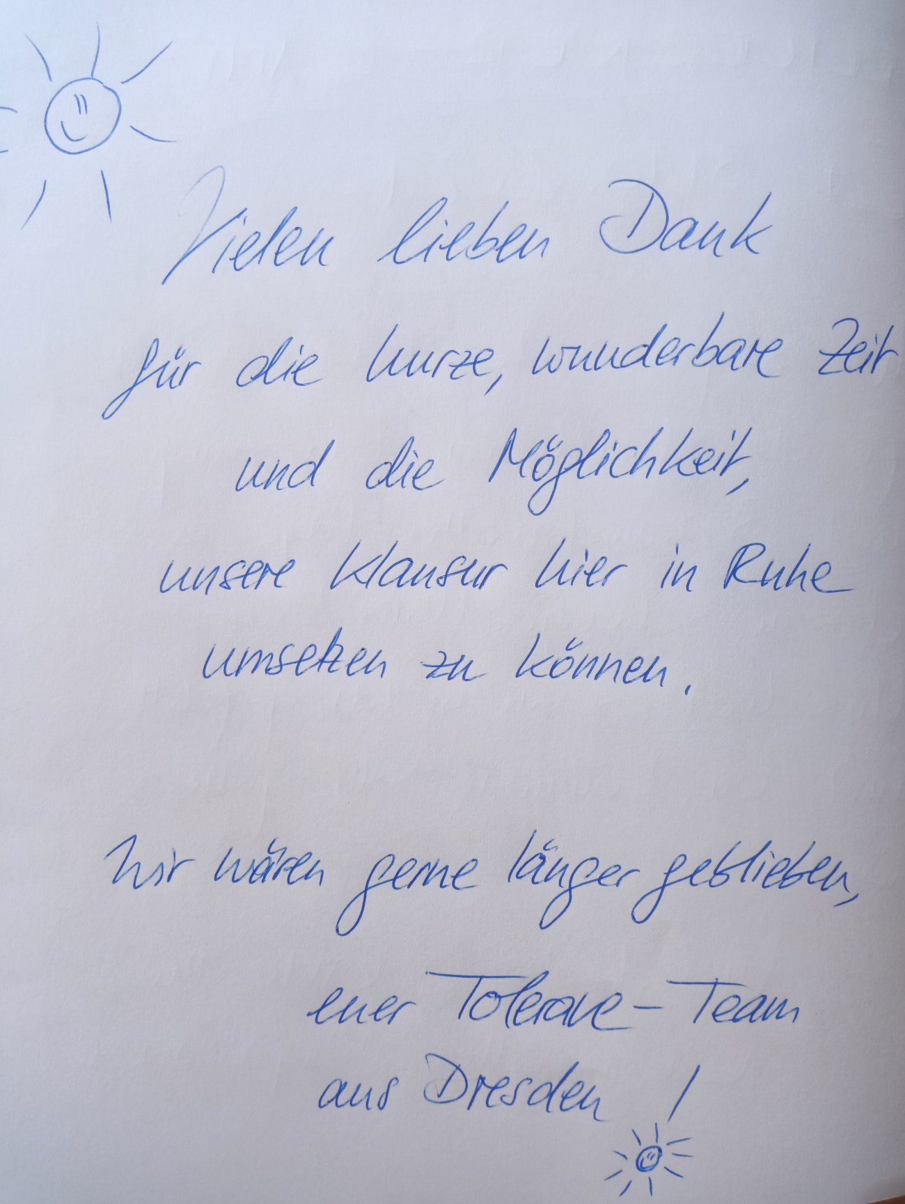 Vielen lieben Dank für die kurze, wunderbare Zeit und die Möglichkeit, unsere Klausur hier in Ruhe umsetzen zu können.