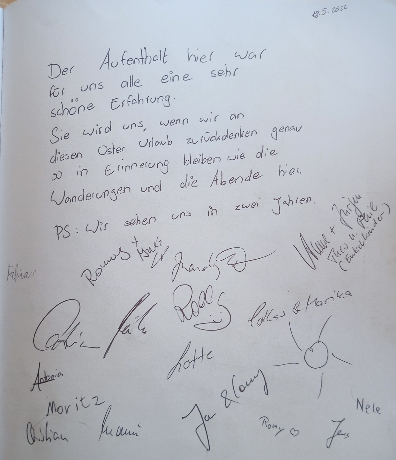 Der Aufenthalt hier war für uns alle eine sehr schöne Erfahrung. Sie wird uns, wenn wir an diesen Oster Urlaub zurückdenken genau so in Erinnerung bleiben wie die Wanderungen und die Abende hier. PS: Wir sehen uns in zwei Jahren.