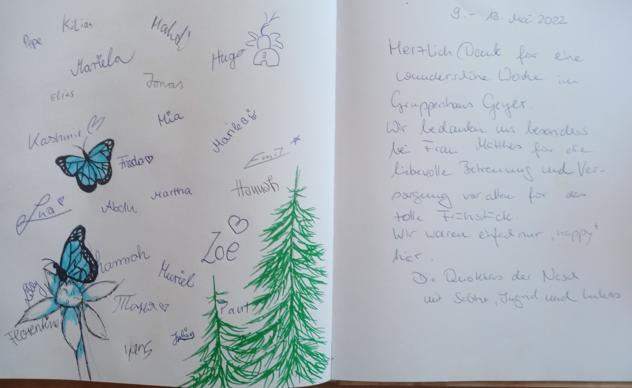 Herzlichen Dank für eine wunderschöne Woche im Gruppenhaus Geyer. Wir bedanken uns besonders bei Frau Matthes für die liebevolle Betreuung und Versorgung vor allem für das tolle Frühstück. Wir waren einfach nur "happy" hier.