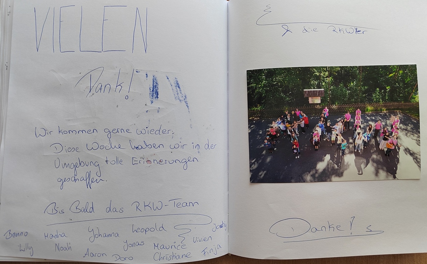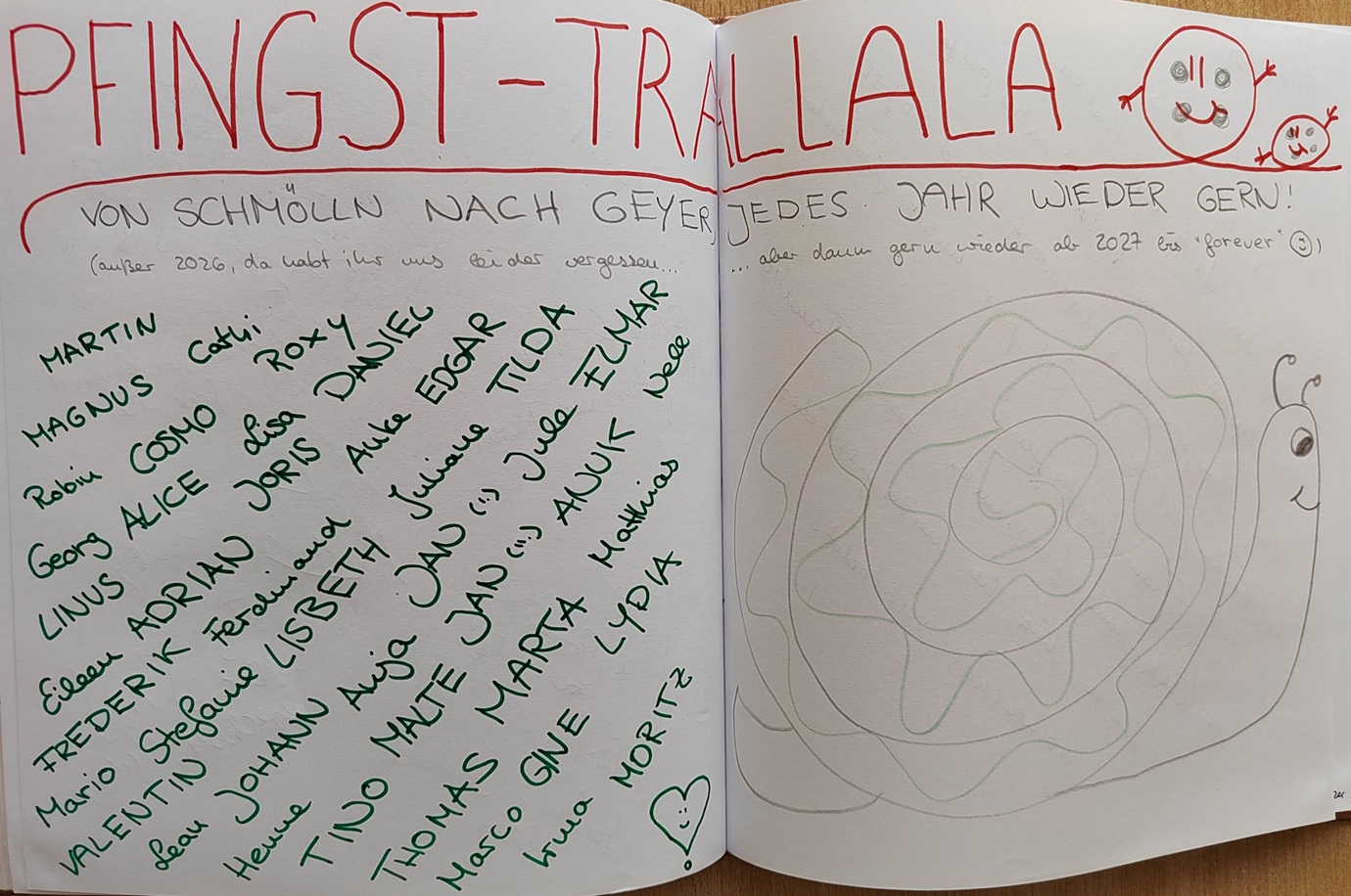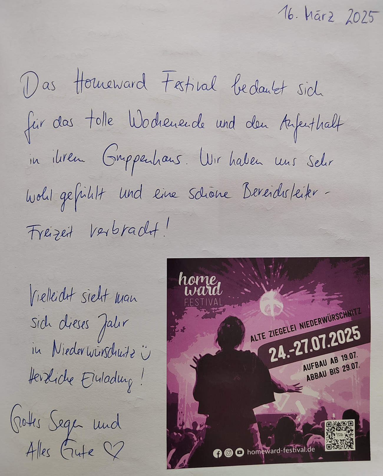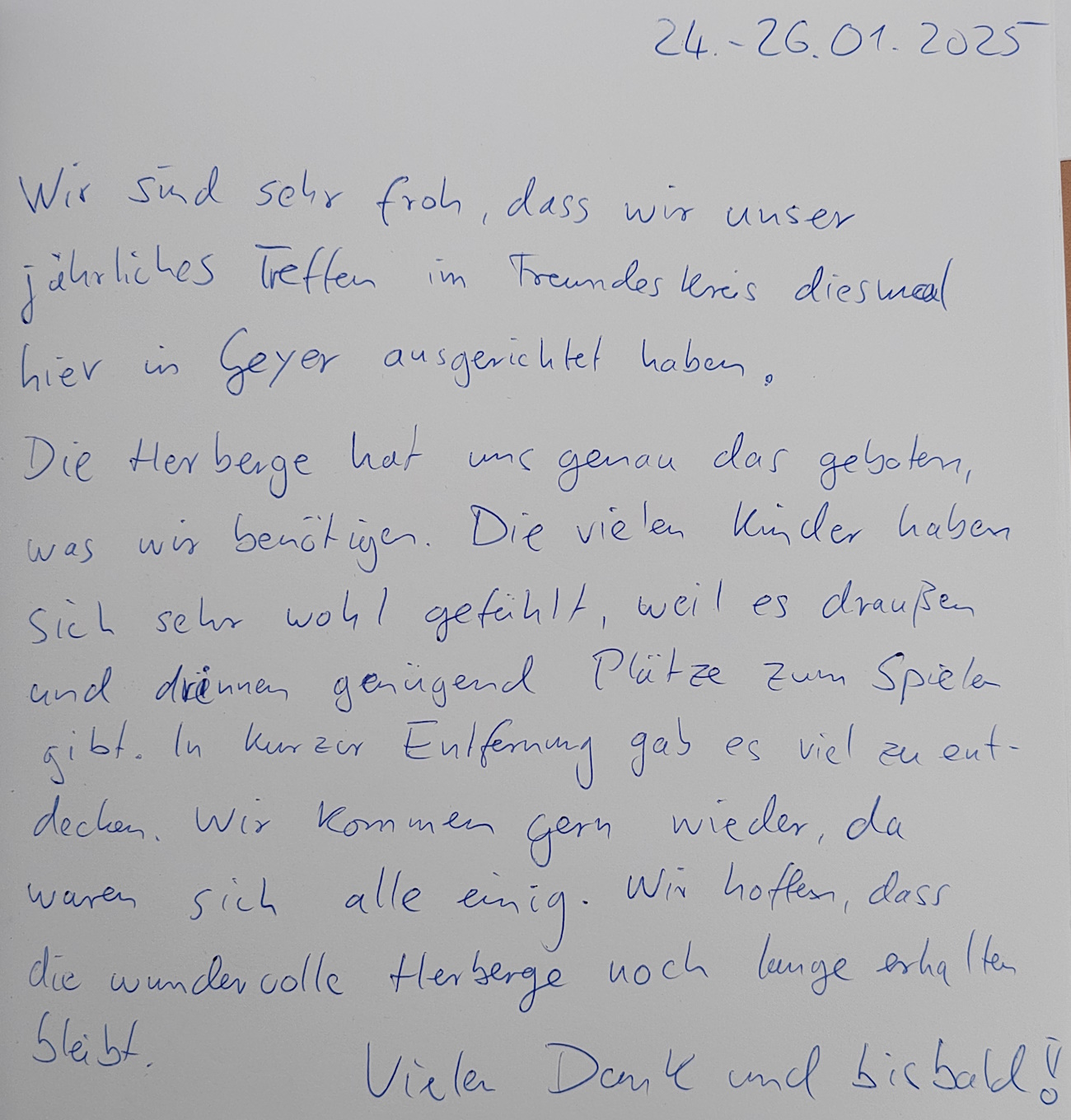 Wir sind sehr froh, dass wir unser jährliches Treffen im Freundeskreis diesmal hier in Geyer ausgerichtet haben. Die Herberge hat uns genau das geboten, was wir benötigen. Die vielen Kinder haben sich sehr wohl gefühlt, weil es draußen und drinnen genügend Platz zum Spielen gibt. In kurzer Entfernung gab es viel zu entdecken. Wir kommen gern wieder, da waren sich alle einig. Wir hoffen, dass die wundervolle Herberge noch lange erhalten bleibt. Vielen Dank und bis bald!