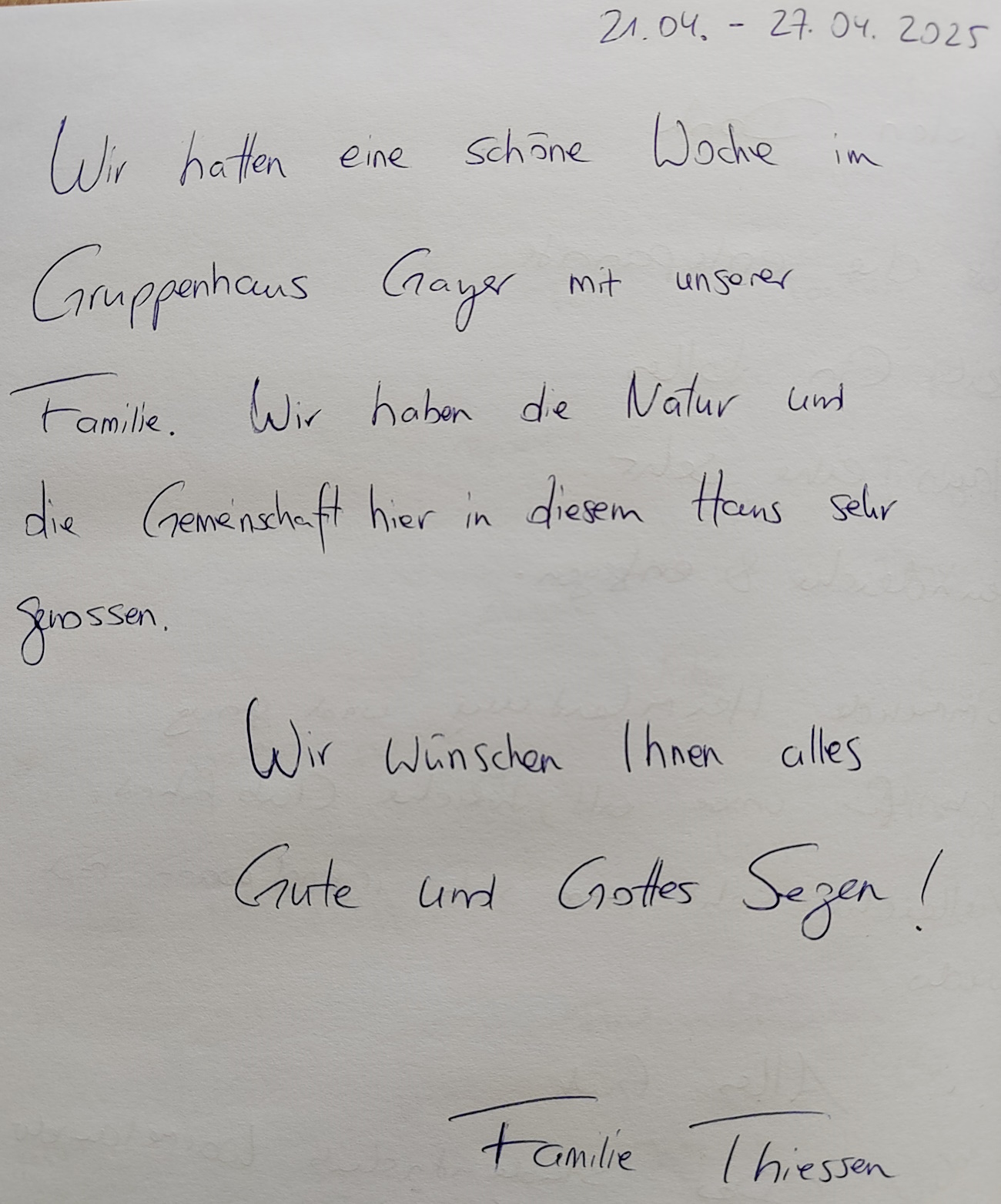 Wir hatten eine schöne Woche im Gruppenhaus Geyer mit unserer Familie. Wir haben die Natur und die Gemeinschaft hier in diesem Haus sehr genossen.