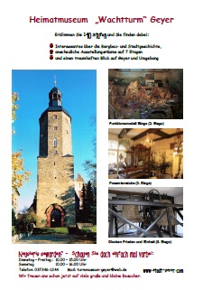 Samstag 10.00 – 16.00 Uhr, Tel. 037346-1244, turmmuseum-geyer@web.de
