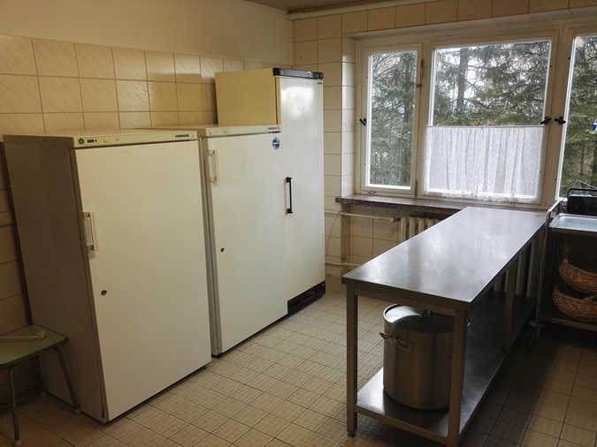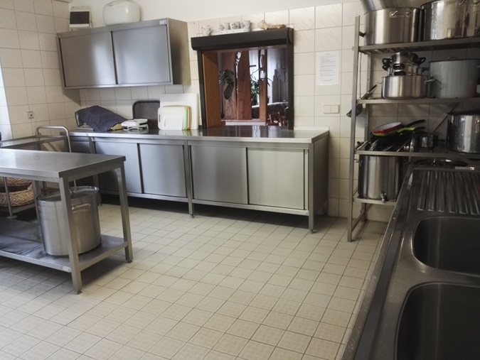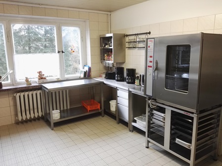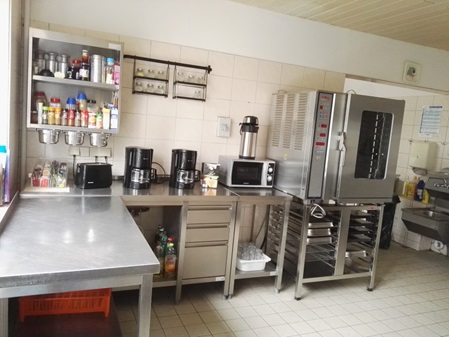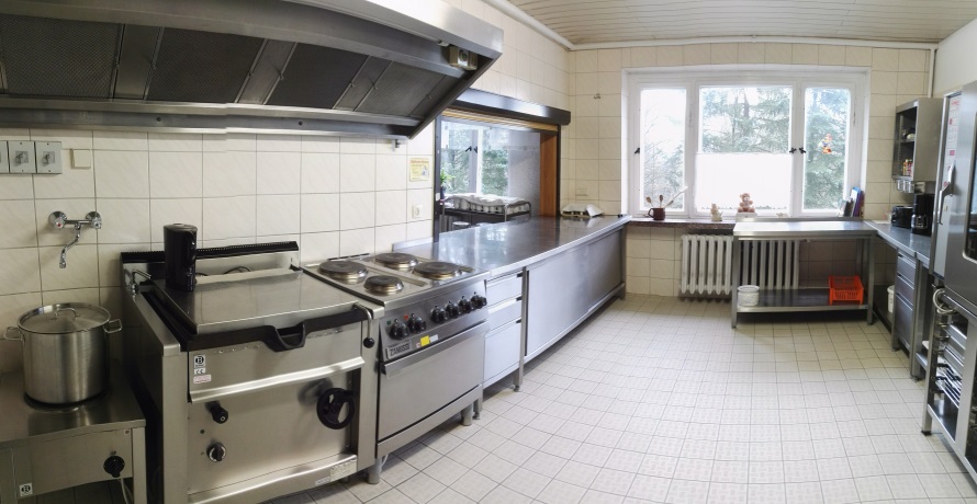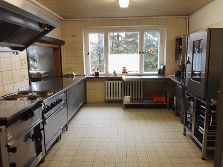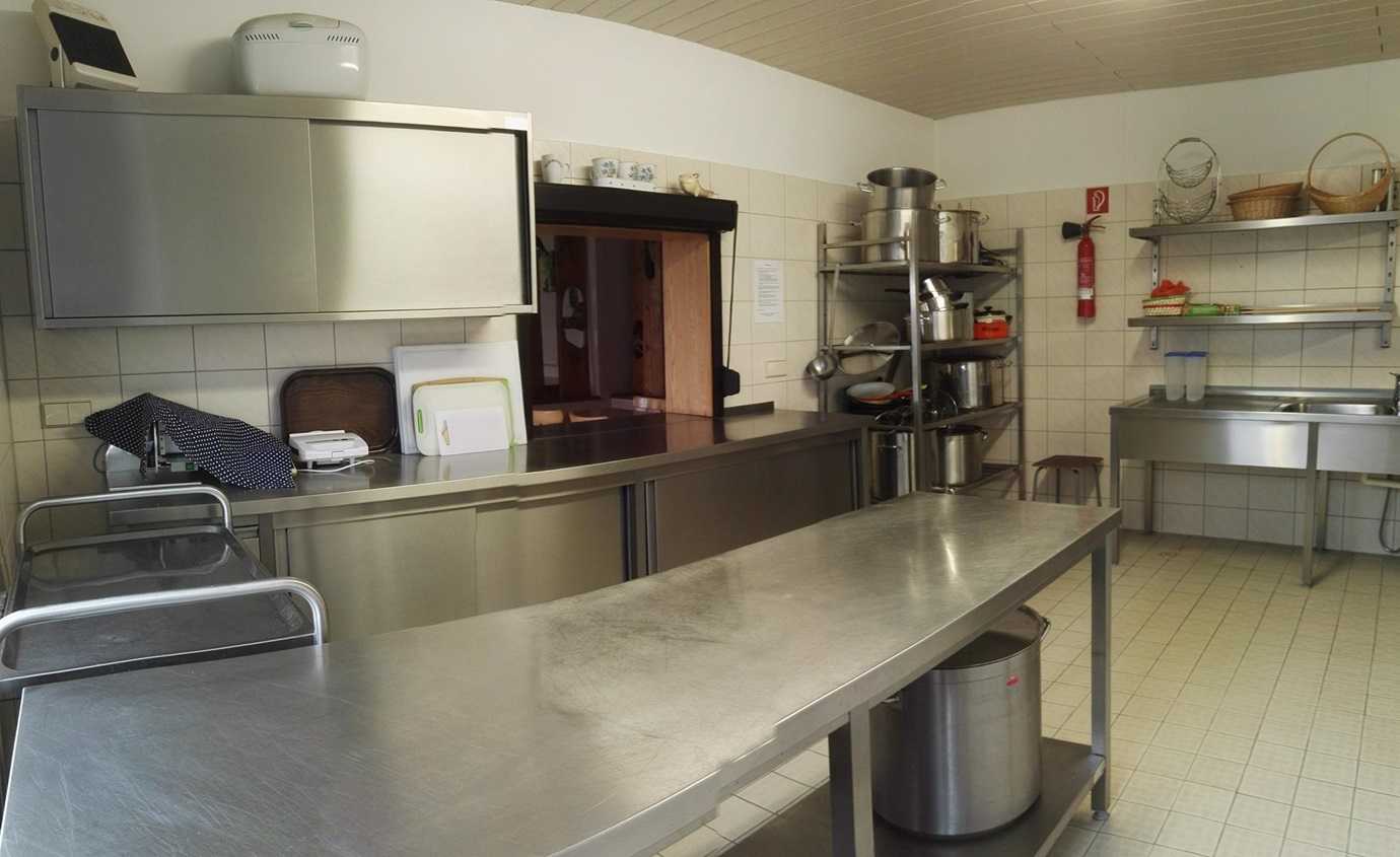 Die Küche besteht insgesamt aus 3 Räumen und wurde kurz vor der Neueröffnung des Hauses als Gruppenhaus, für Jugendherbergsgruppen genutzt. Sie ist voll ausgestattet für die gastronomische Versorgung von bis zu 80 Personen und lässt mit Ihren professionellen Geräten und Mobiliar keine Wünsche offen.
