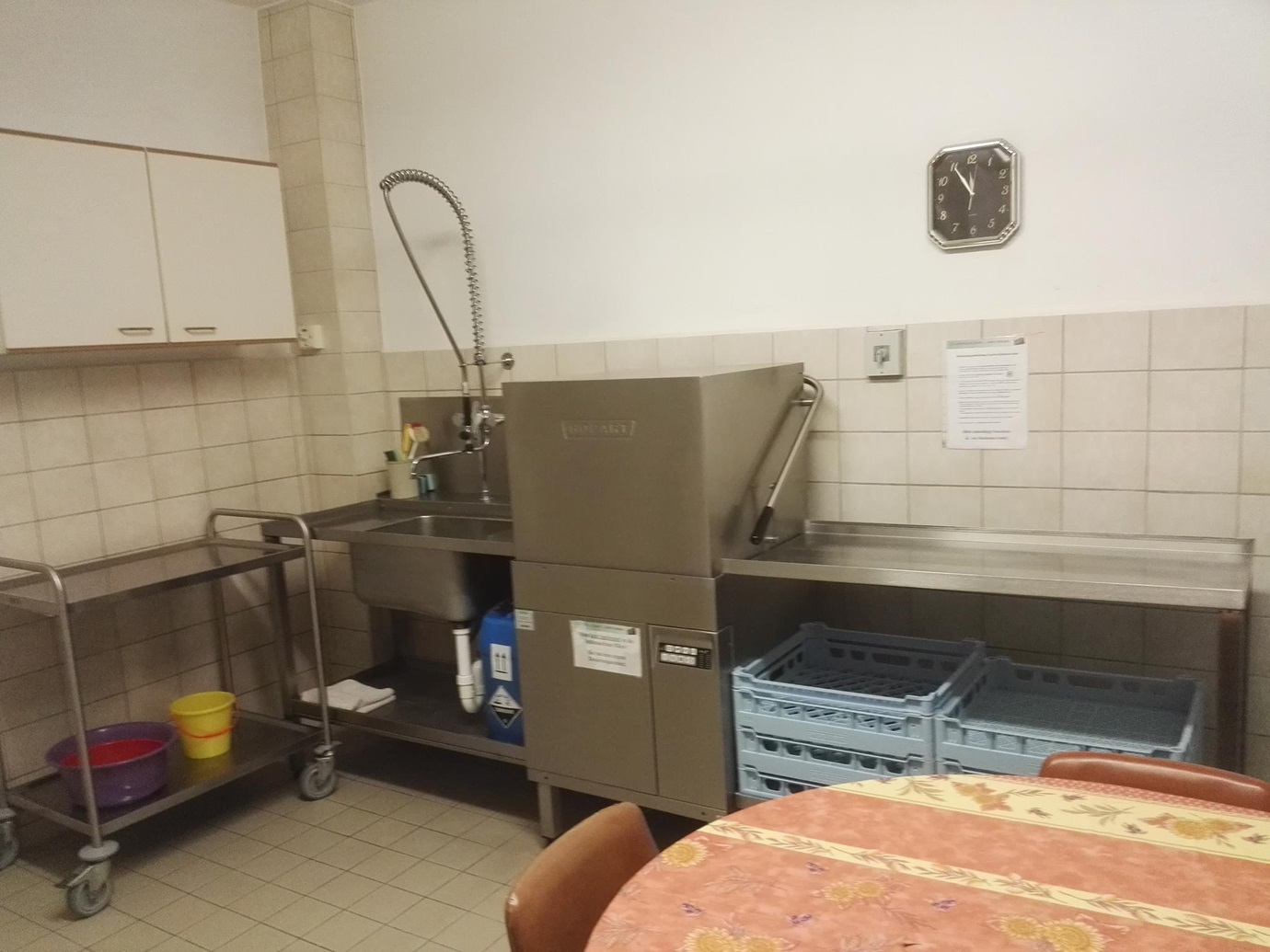 Von der Kochküche und Spülküche gibt es jeweils Durchreichen in der Wand zum großen Speisesaal. Von der Vorbereitungsküche gibt es eine Durchreiche zum Tagesraum.